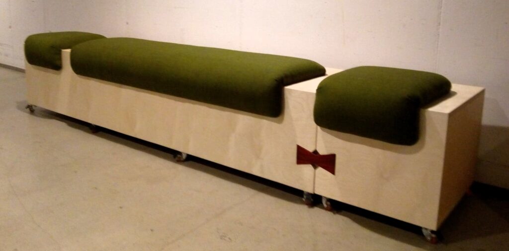 Opbergbank voor tapijt: multiplex berk, padouk, mousse, stof